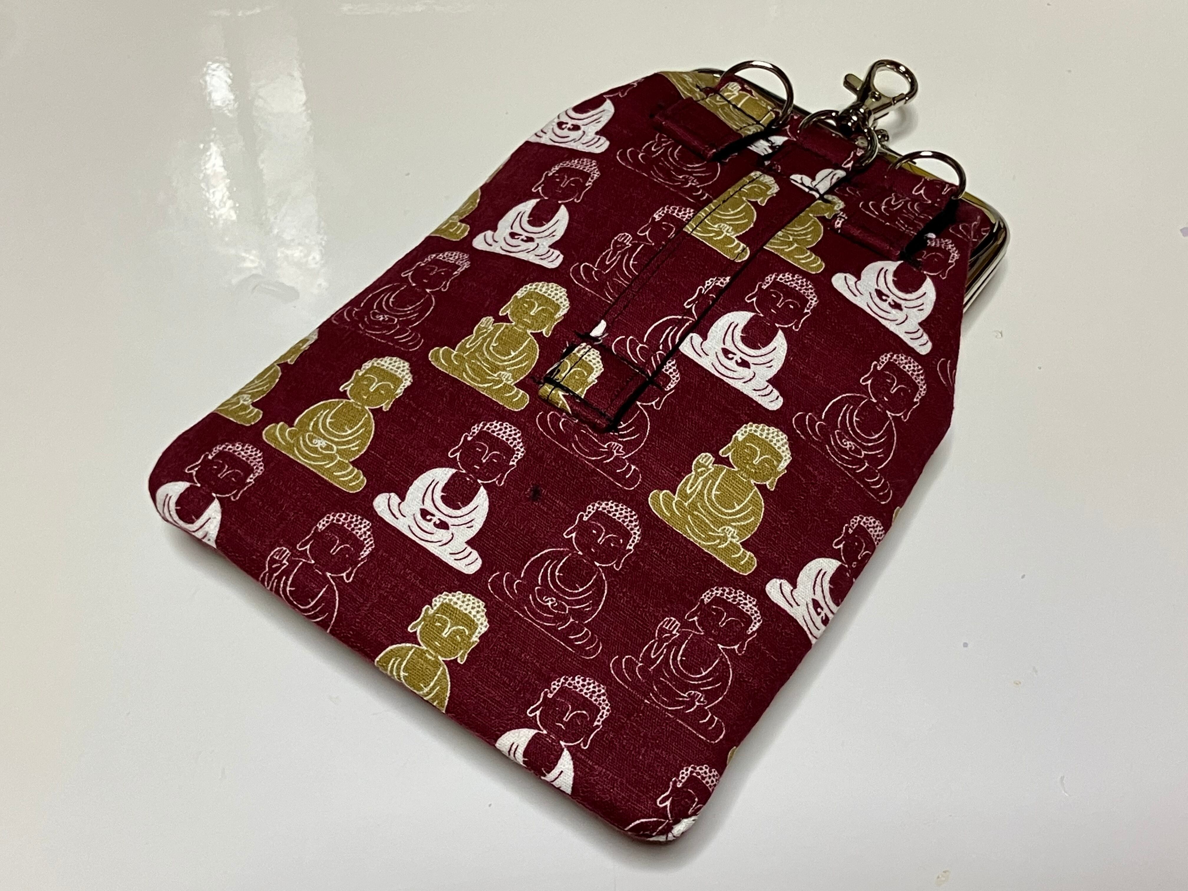 ベルトに通したり、カバンやベルト通しに引っ掛けたり、紐でポーチにもなる3wayのがま口携帯ポーチLサイズです。