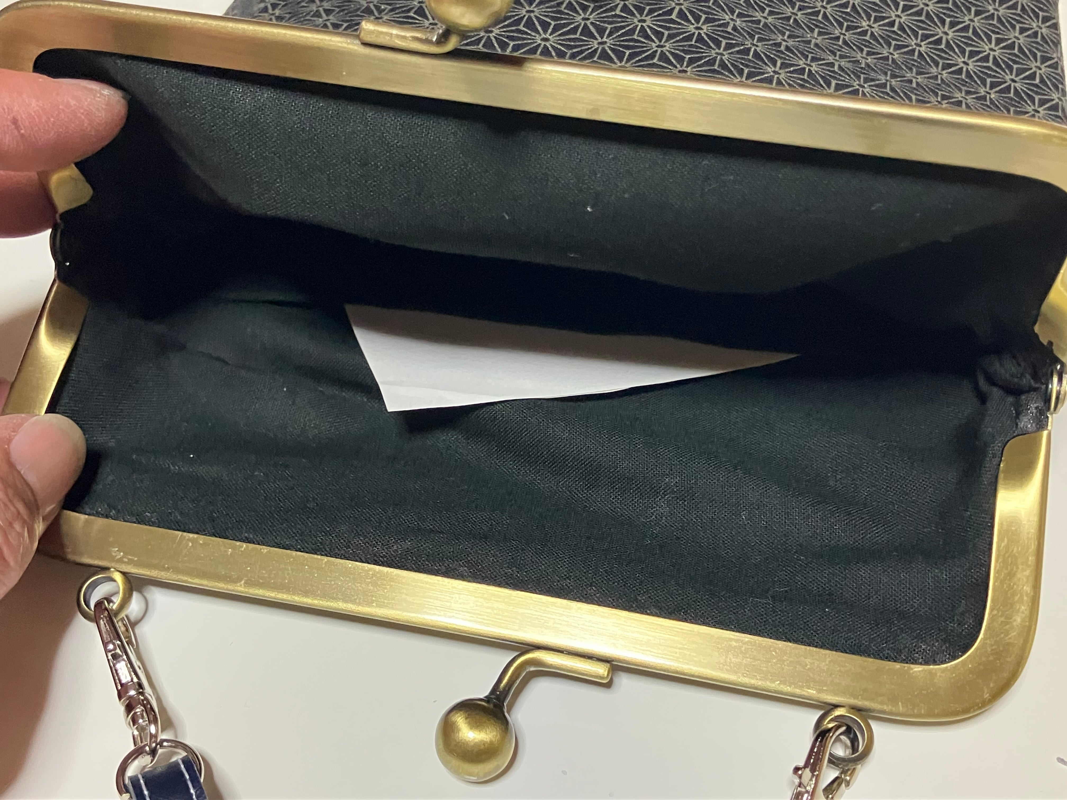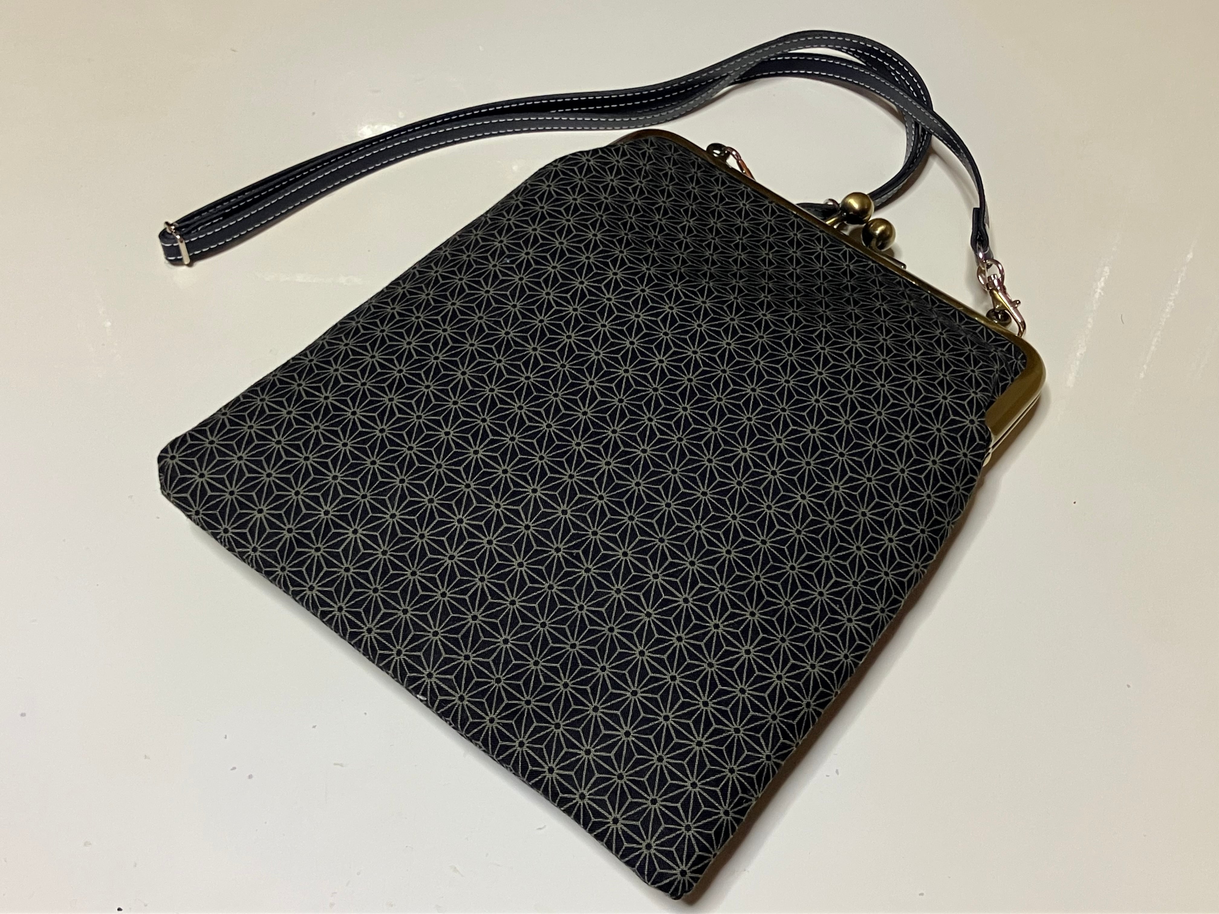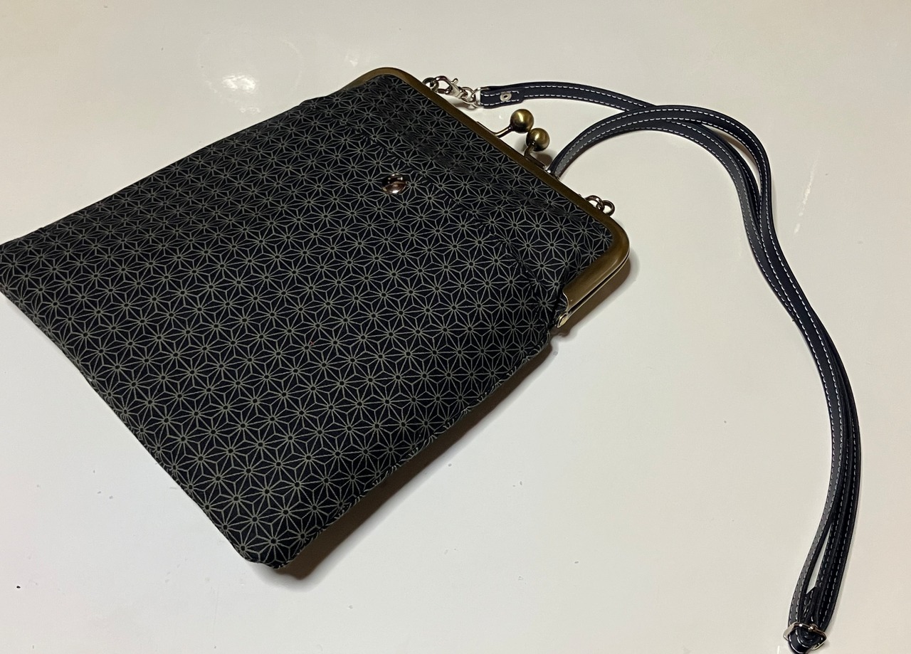 長財布もすっぽり入る便利なサイズのがま口ショルダーポーチです。